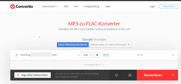 Schritt 4 Besuchen Sie die Webseite von Convertio und klicken Sie auf „Dateien wählen“, um Spotify MP3-Dateien hinzuzufügen. Nach dem Hinzufügen klicken Sie auf „Konvertieren“ > „Download“, um Spotify in FLAC-Dateien herunterzuladen.